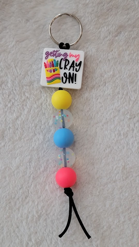 This "Getting my cray-on" Teacher Keychain is a fun play on words, perfect for any teacher. Made with silicone beads, it's both durable and playful, making it a great accessory for any classroom. Show off your love for teaching with this unique and stylish keychain.