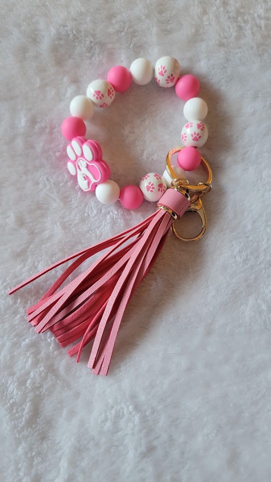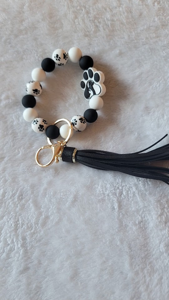 This Paw Print Wristlet looks stylish and keeps your essentials secure. Crafted with silicone beads and and a golden key ring, this wristlet can accompany you to any occasion.