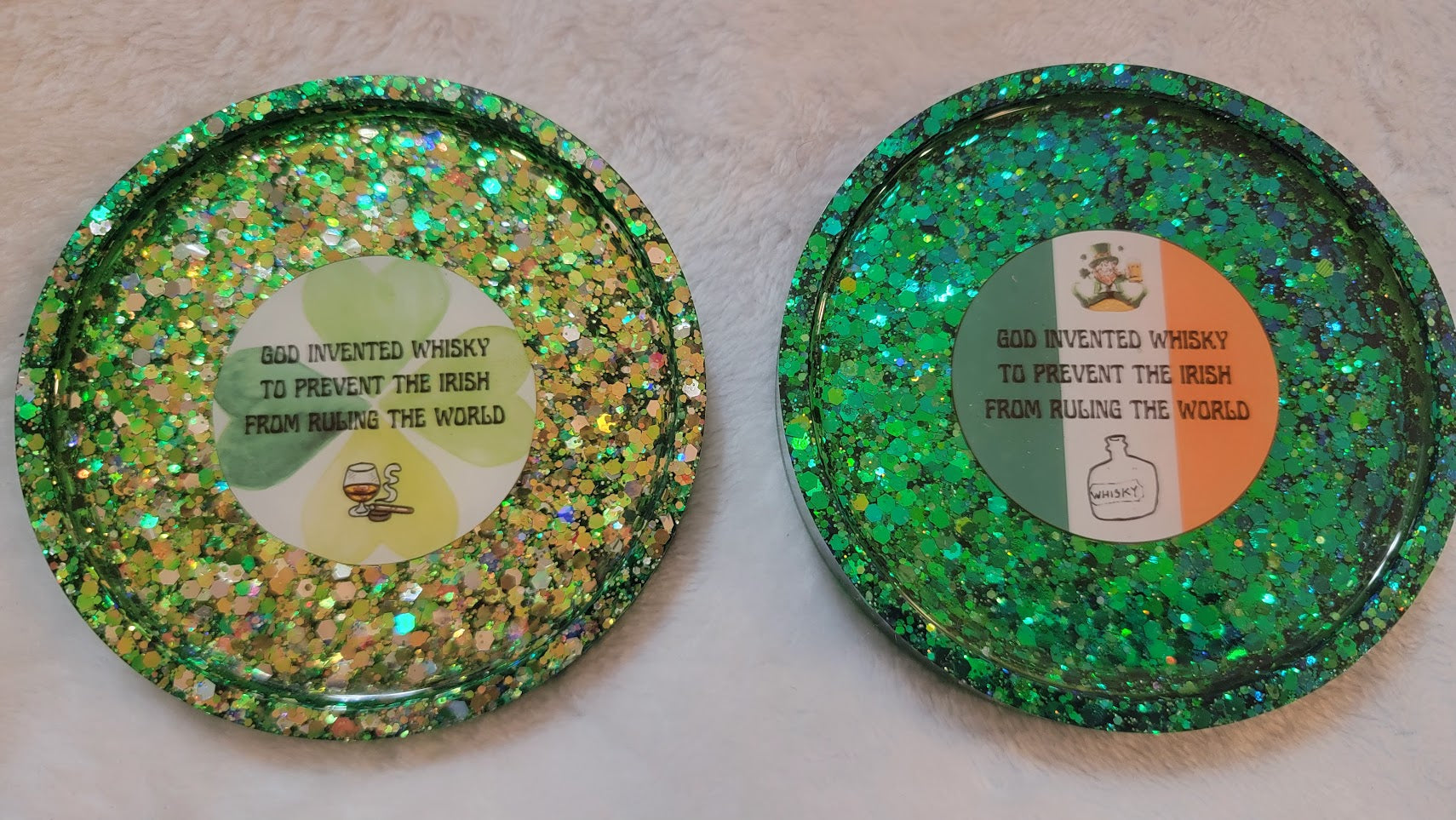 These resin coasters or candy dishes are uniquely designed with an Irish theme. Perfect for adding a touch of Celtic charm to your home decor. Crafted with high-quality materials, these versatile pieces can be used as coasters or candy dishes, providing both functionality and beauty. Add a bit of the Emerald Isle to your home with these charming Irish coasters/candy dishes.