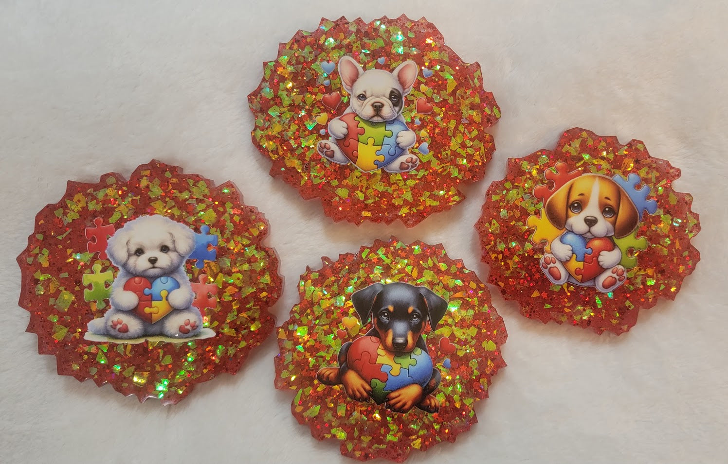 These Puppy Autism Coasters are not only visually appealing with their adorable puppy images holding an autism heart, but also functional with a cork bottom that prevents moisture. The coasters also have a sturdy red base and a touch of sparkle with green and red glitter. Perfect for any pet or autism lover's home.