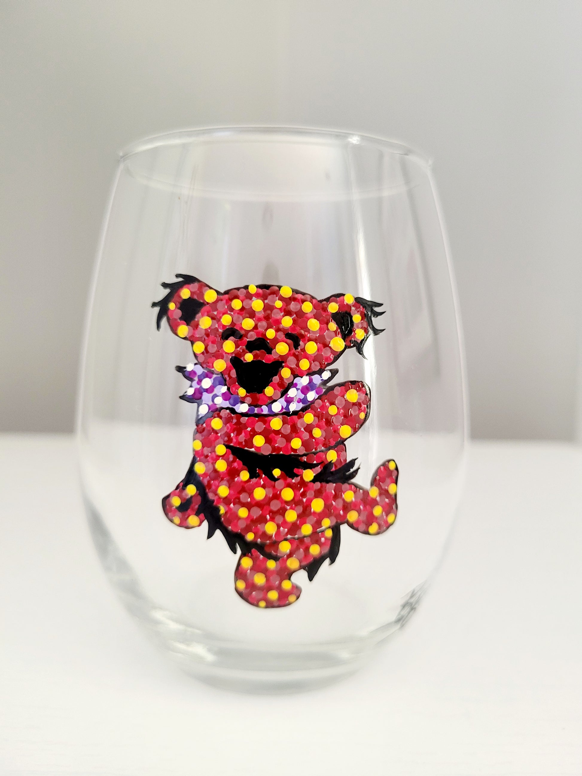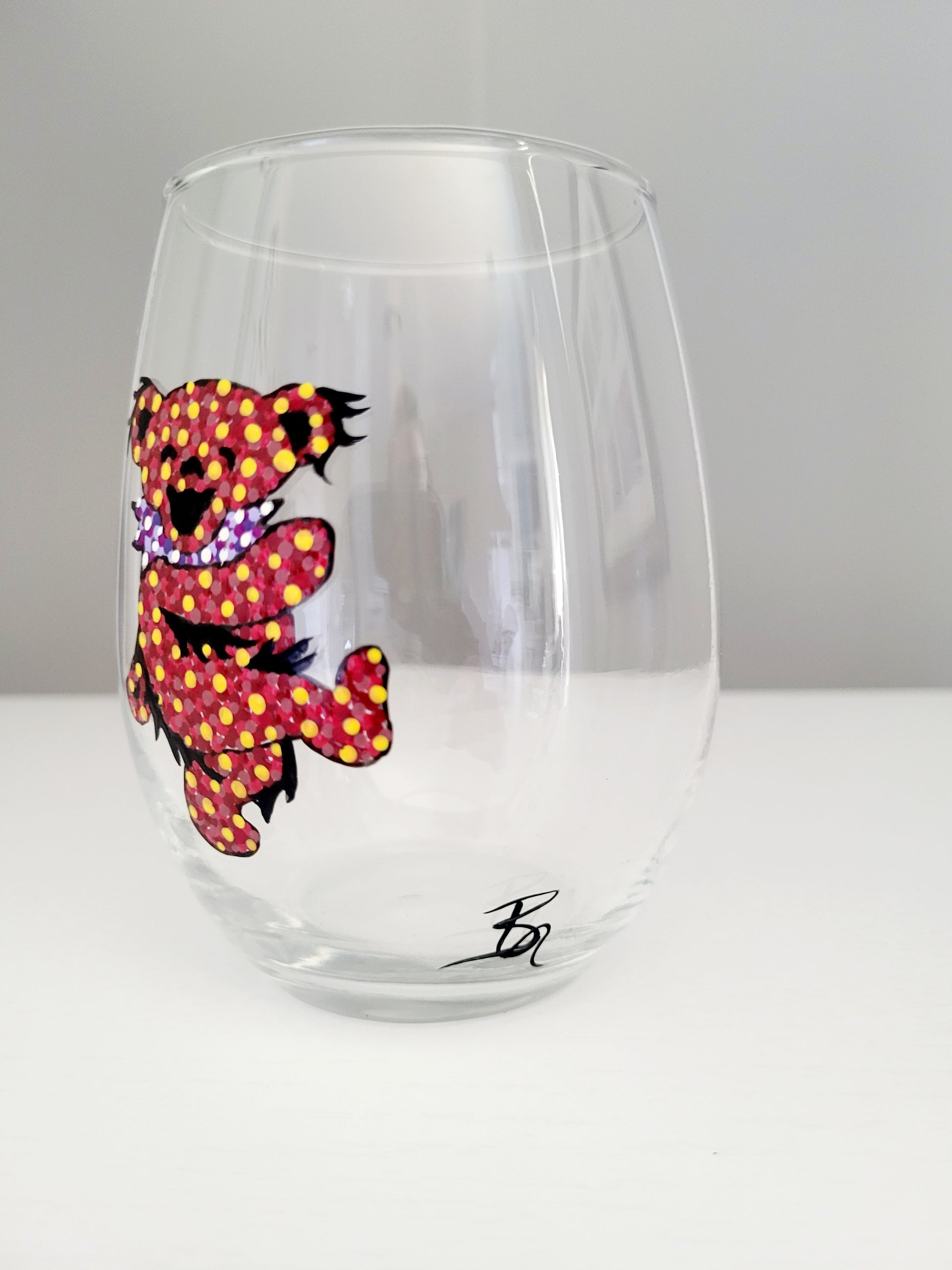 This Dancing Bear stemless wine glass is perfect for classic rock lovers! Hand painted with expert craftsmanship, it adds a touch of unique flair to your collection. Enjoy your favorite beverage while reminiscing on the good old days.