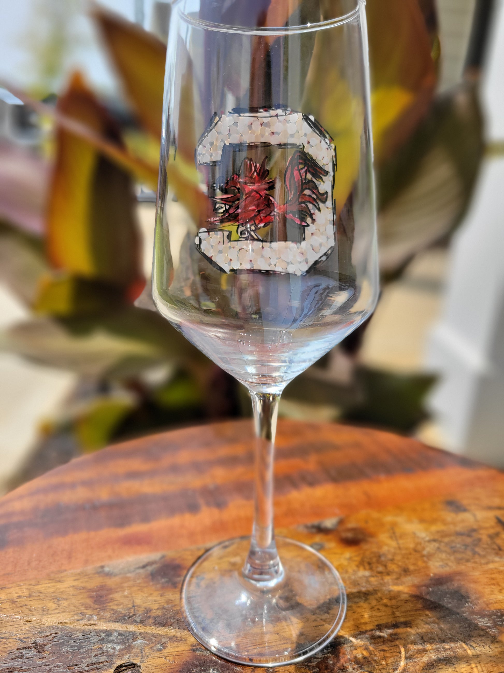 Show off your team spirit with this hand-painted Gamecock wine glass. Represent your college football team while sipping in style. Each glass is carefully crafted with love, making it the perfect addition to any game day celebration. Cheers to your team's success!