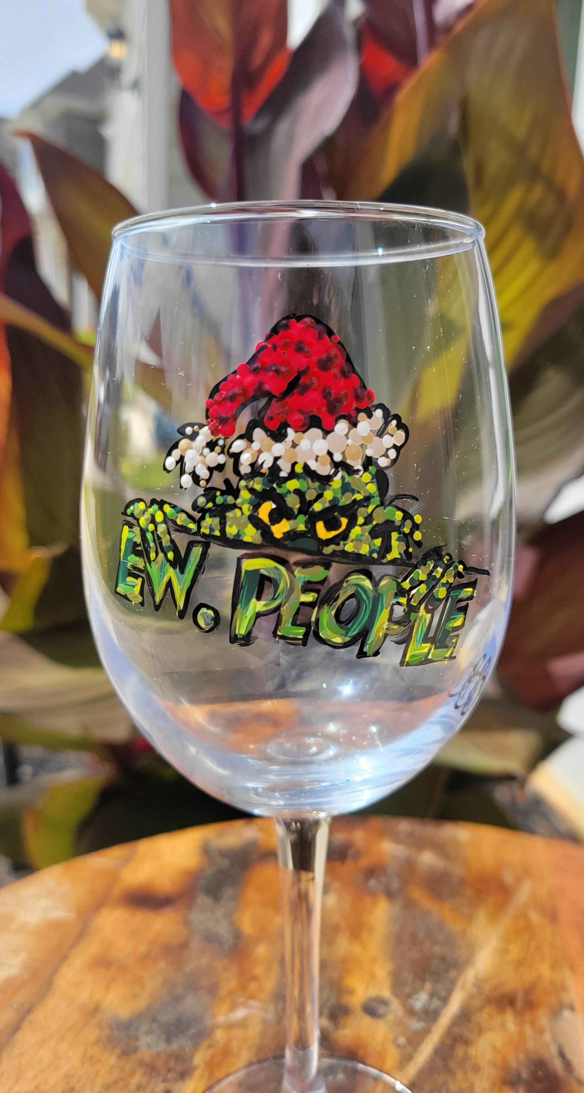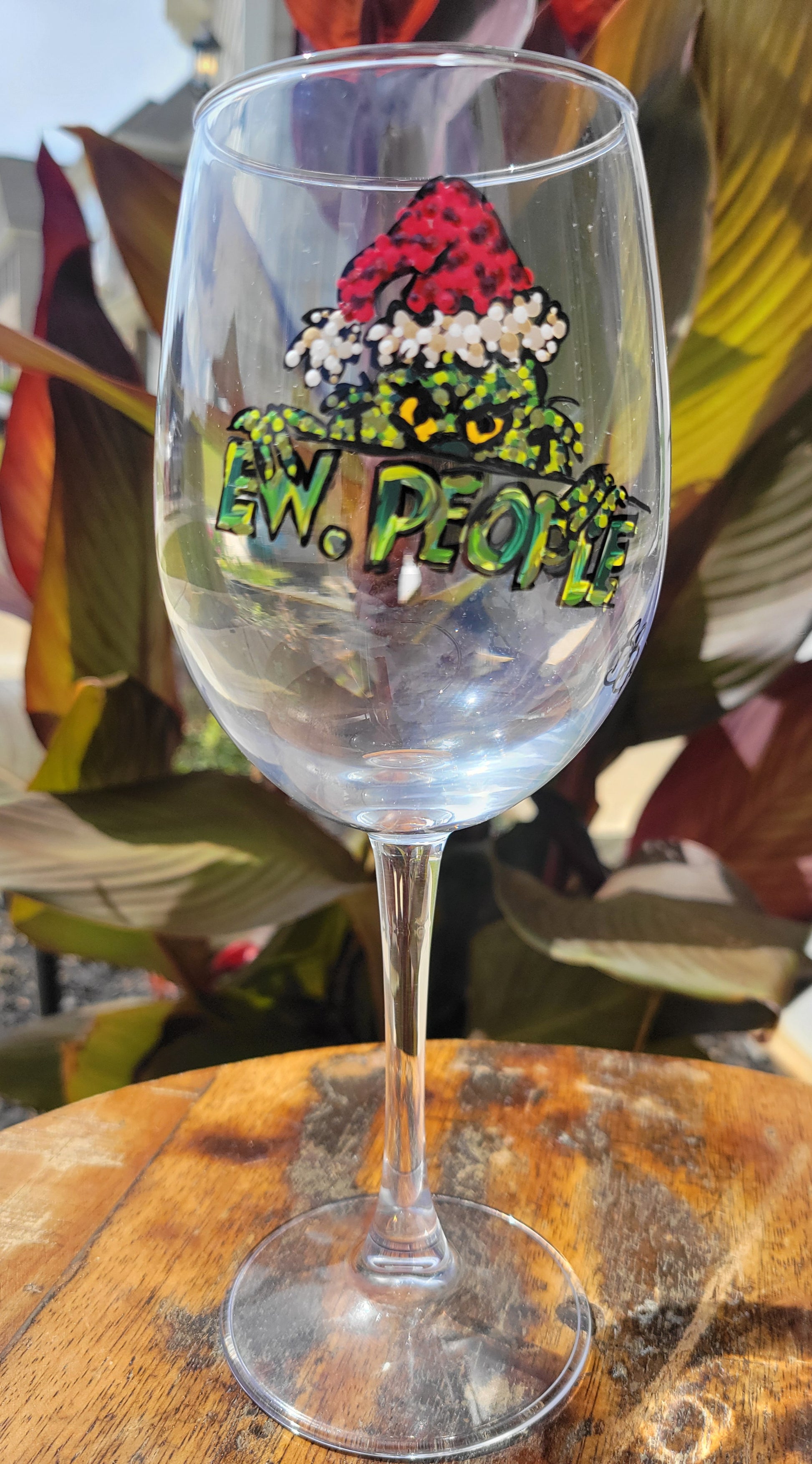 This hand painted wine glass features the Grinch and the phrase "Ew People." Perfect for the holiday season or any occasion, this unique glass adds a touch of humor to your drinkware collection. Made with quality and care, it's a must-have for any fan of the beloved Christmas character. Cheers to the Grinch and avoiding people!
