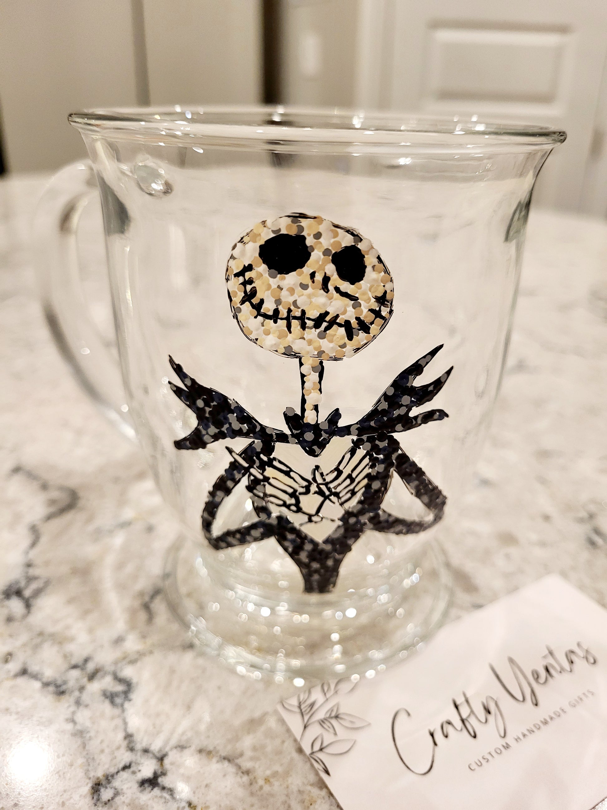 Enjoy your favorite morning coffee in this glass mug featuring Jack Skellington from "The Nightmare Before Christmas". Hand painted with a dot mosaic, this cup is perfect for enjoying an extra spooky cup of joe.