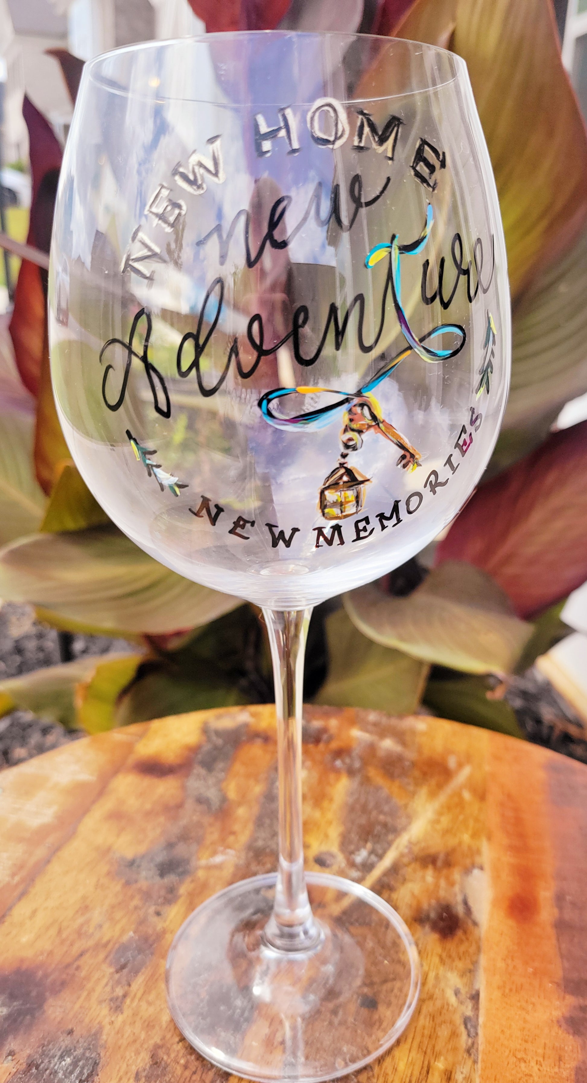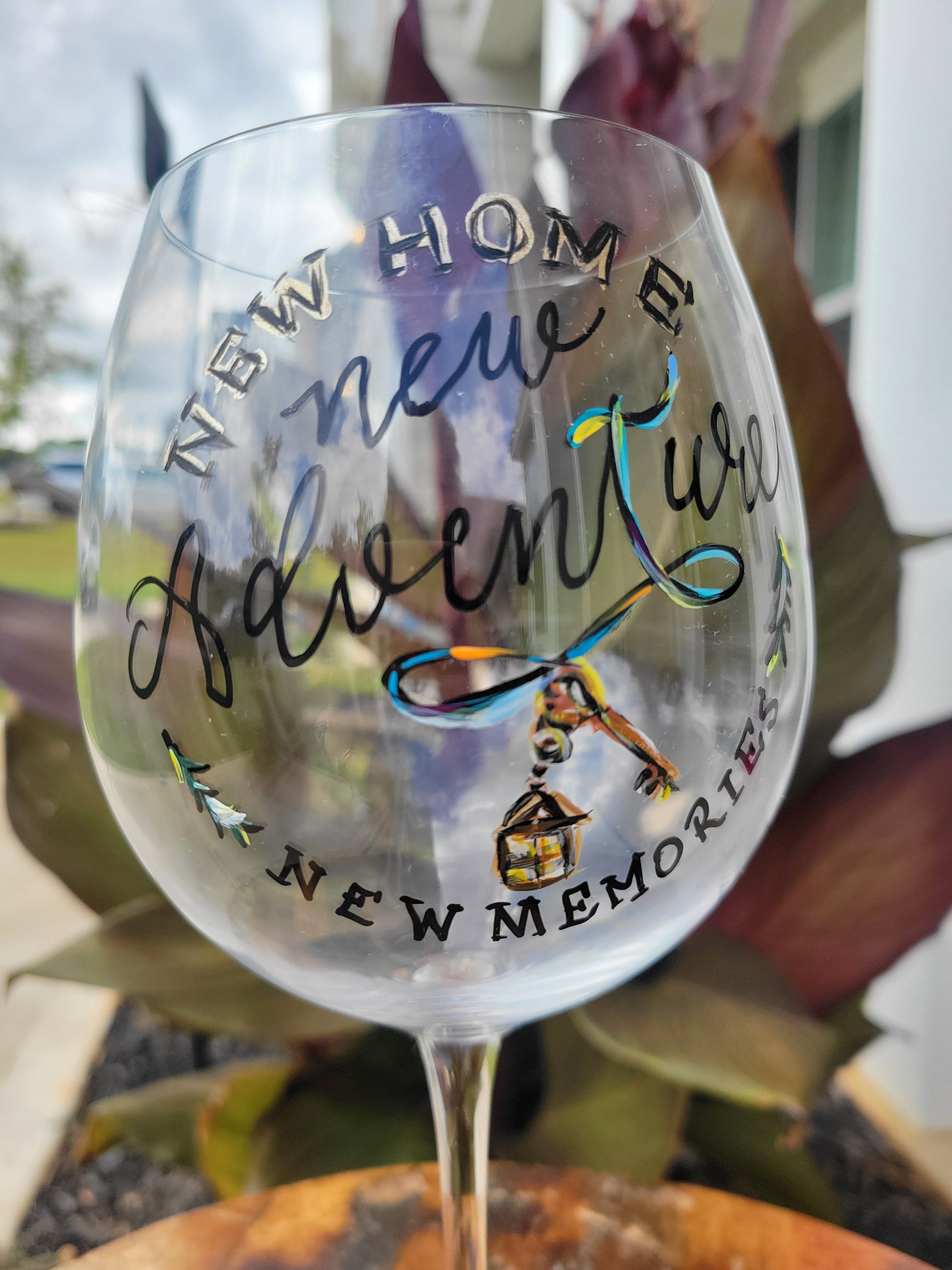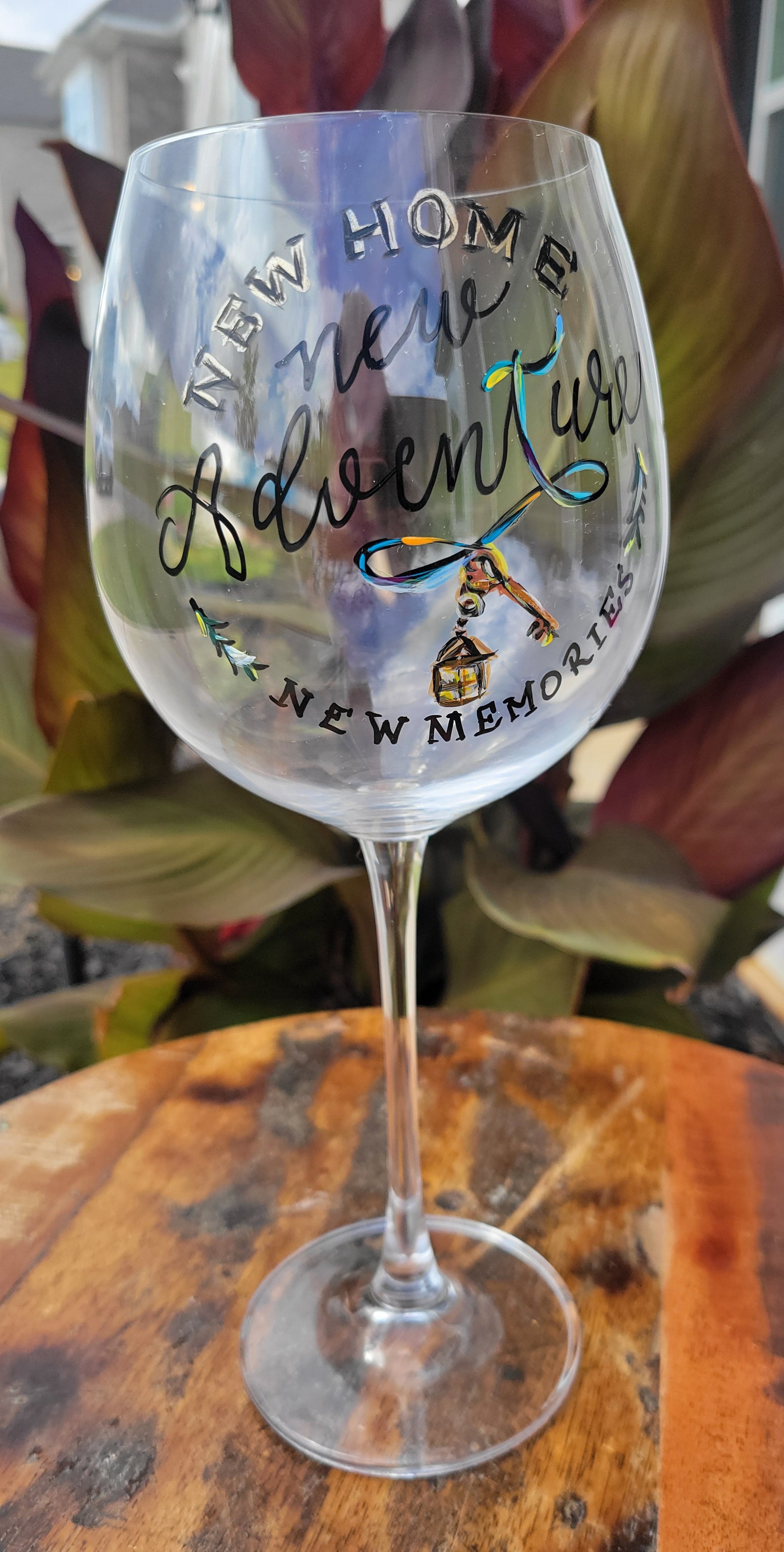 Celebrate new beginnings with our hand painted New Adventure wine glass. Perfect for toasting to new homes and exciting journeys. Cheers to new memories!