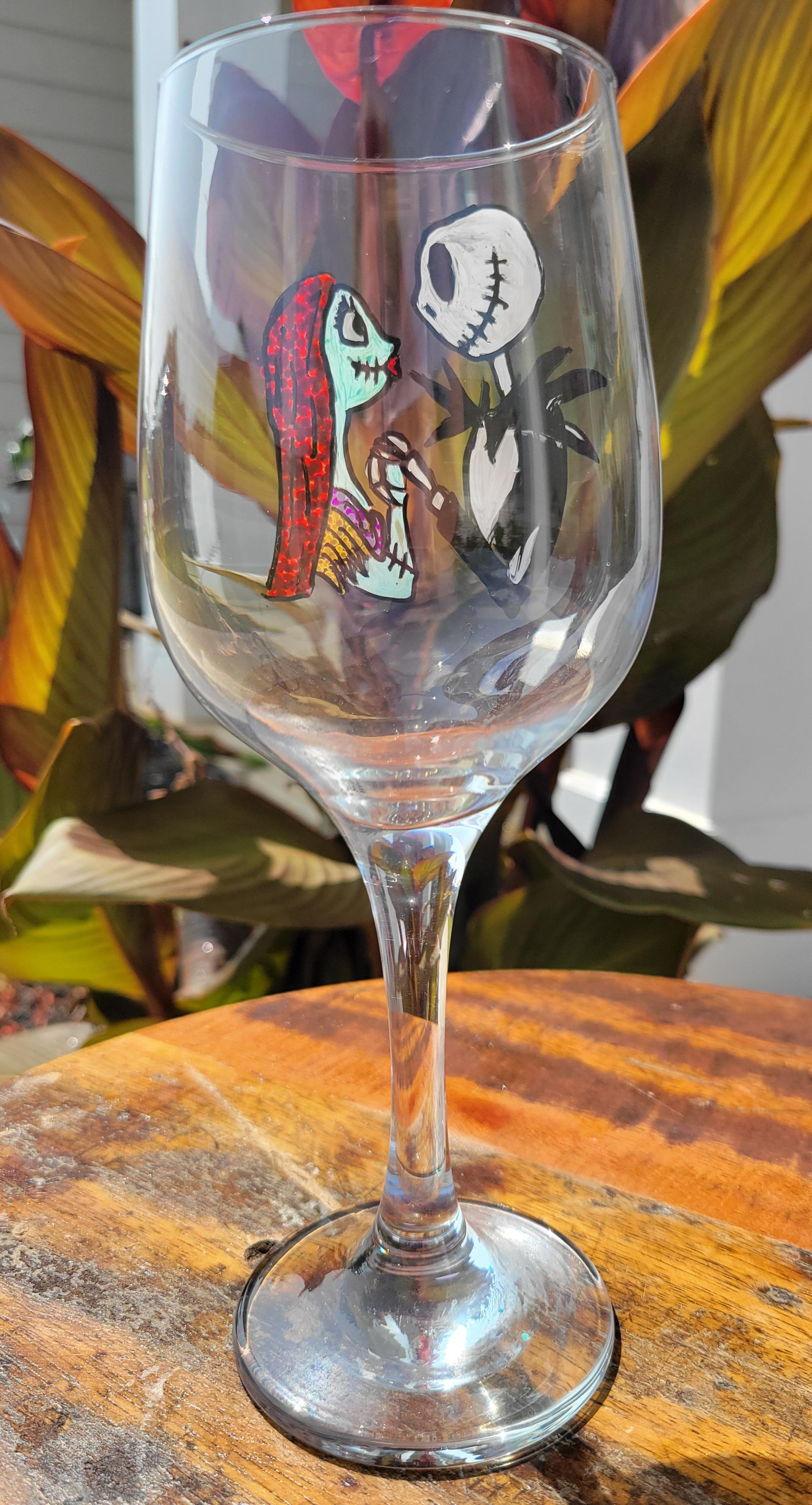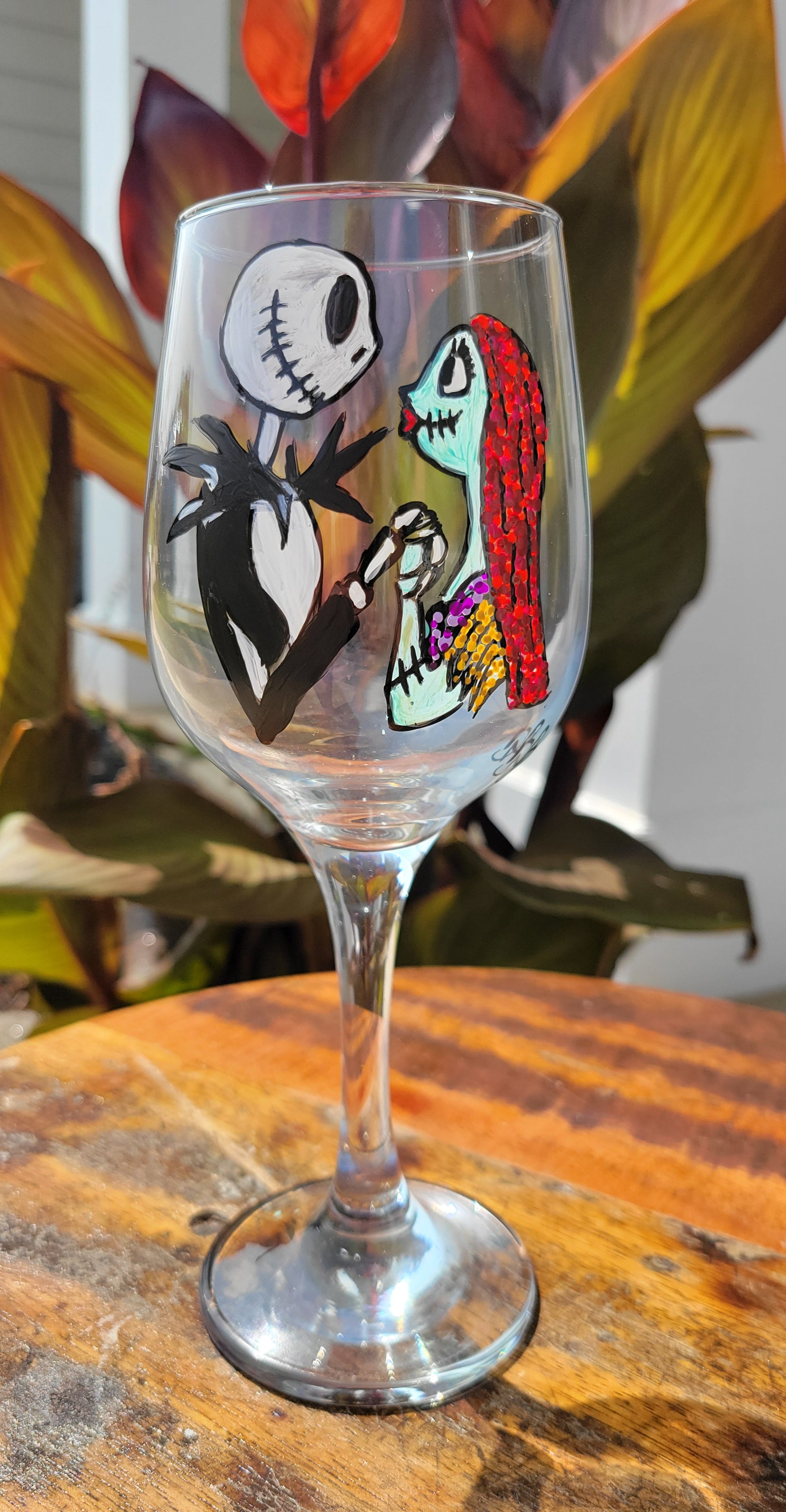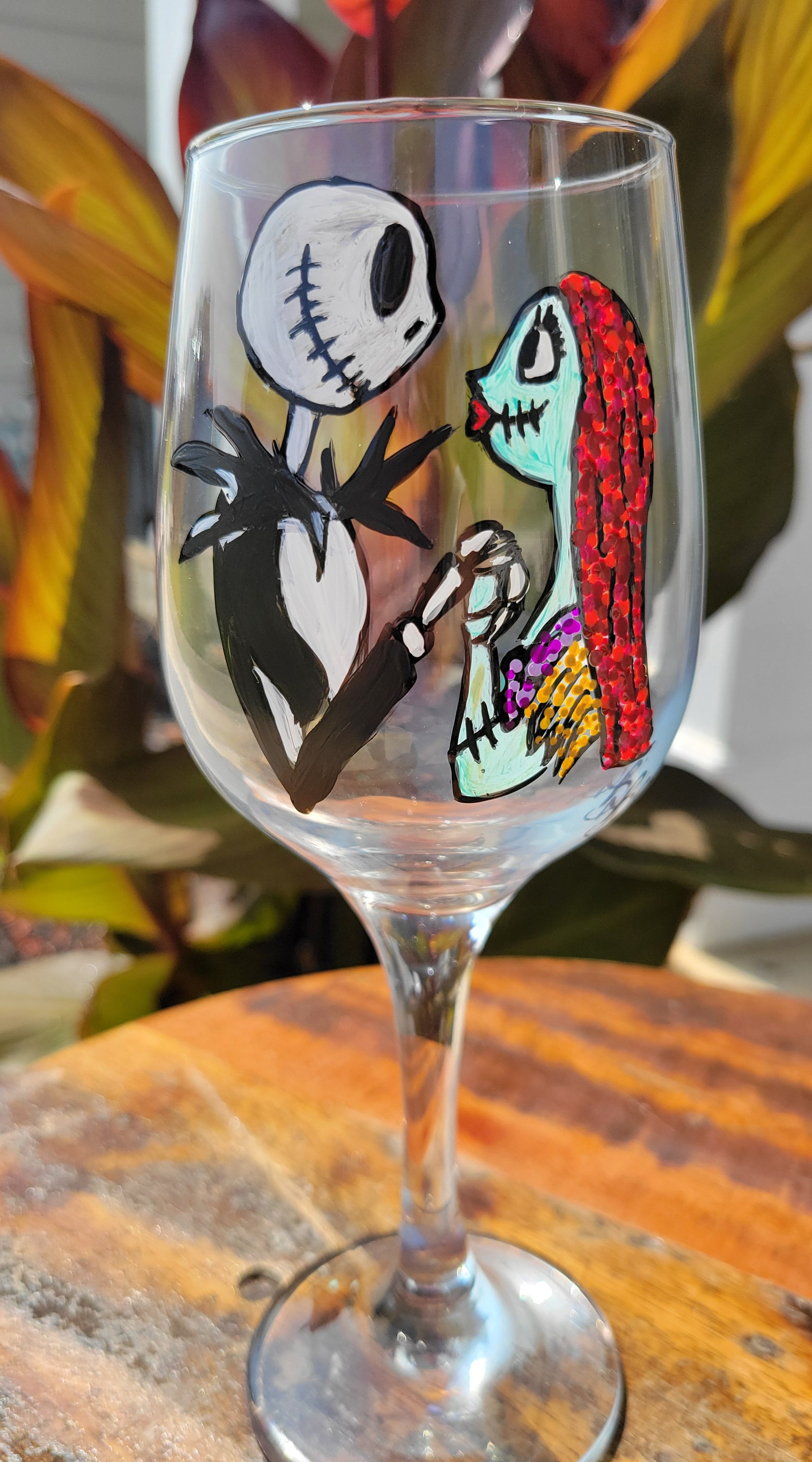 This hand painted wine glass features a one-of-a-kind design of the beloved Jack Skellington and Sally from the classic movie, Nightmare Before Christmas. Each piece is meticulously crafted and perfect for any fan of the film. Add a touch of unique style to your glassware collection with this hand painted masterpiece.