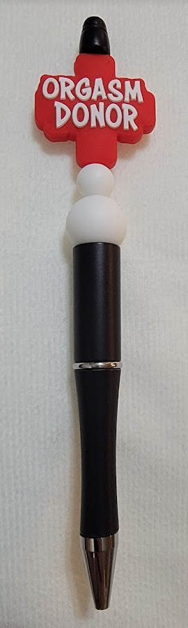 This "Orgasm Donor” Pen is designed to satisfy your writing needs. Featuring a funny saying, this eye-catching pen is beaded for a comfortable grip. Enjoy writing or doodling with a pen that you'll love using.