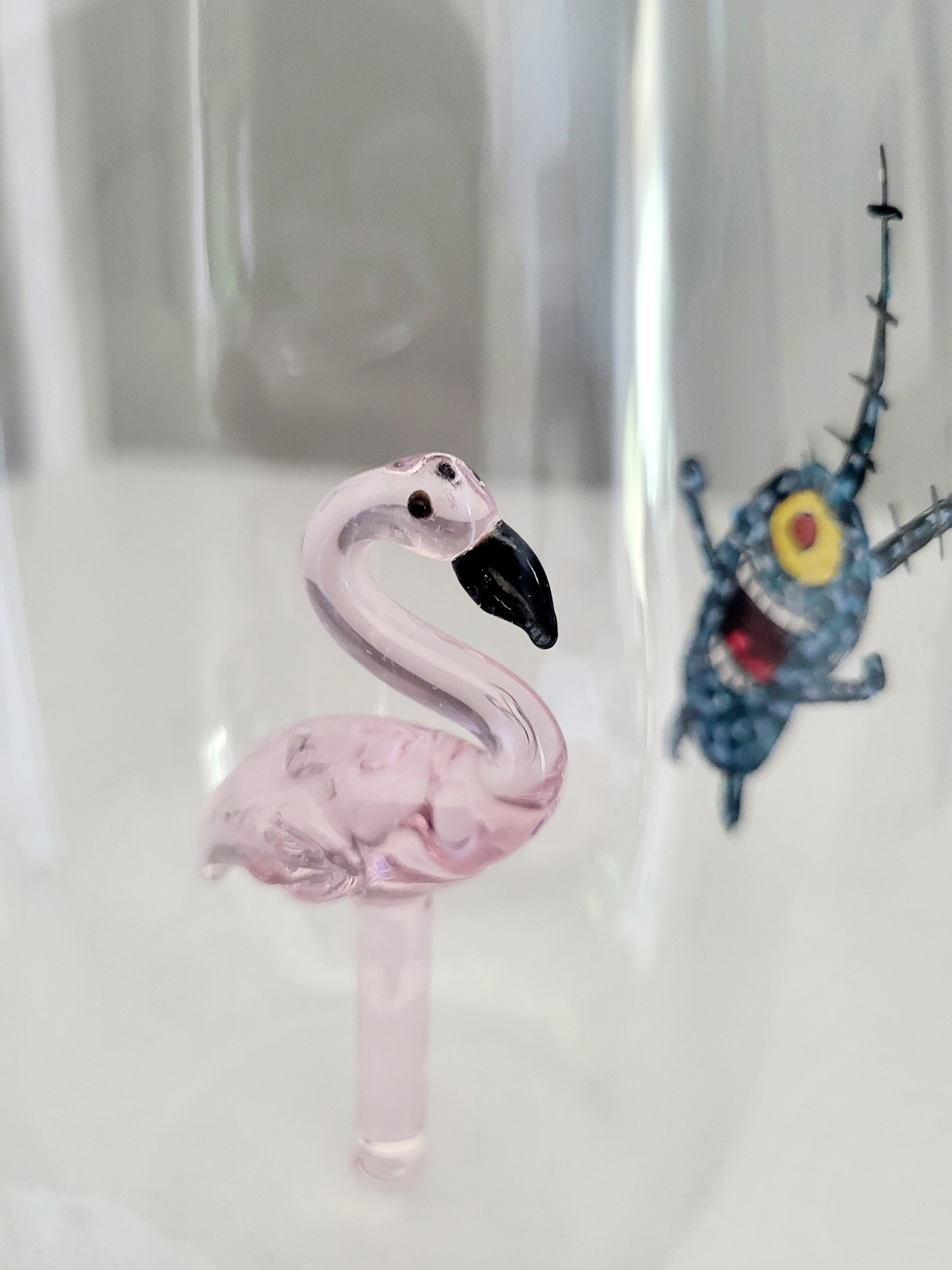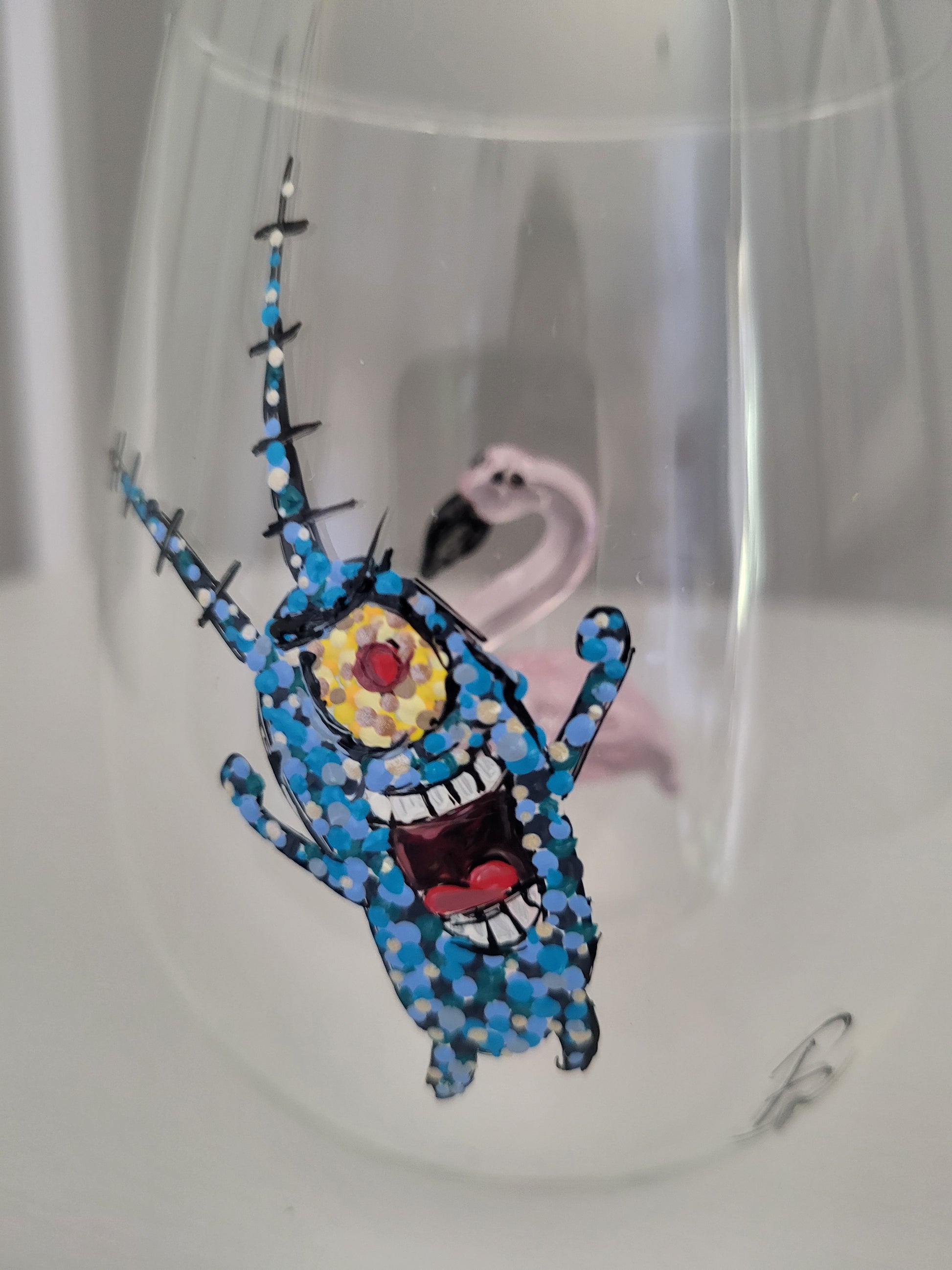 Introducing our unique and hand painted Plankton wine glass! Crafted with blown glass and featuring a delightful flamingo inside, this stemless glass adds a touch of humor (flamingos eat plankton, hehe) to your drinkware collection. Perfect for fans of Spongebob and a great conversation starter. Cheers to fun and creativity!