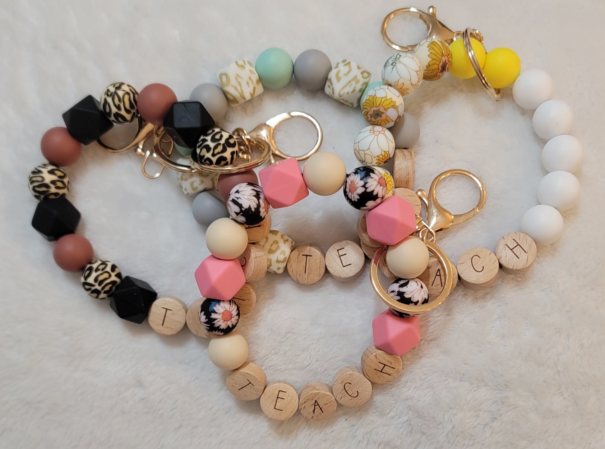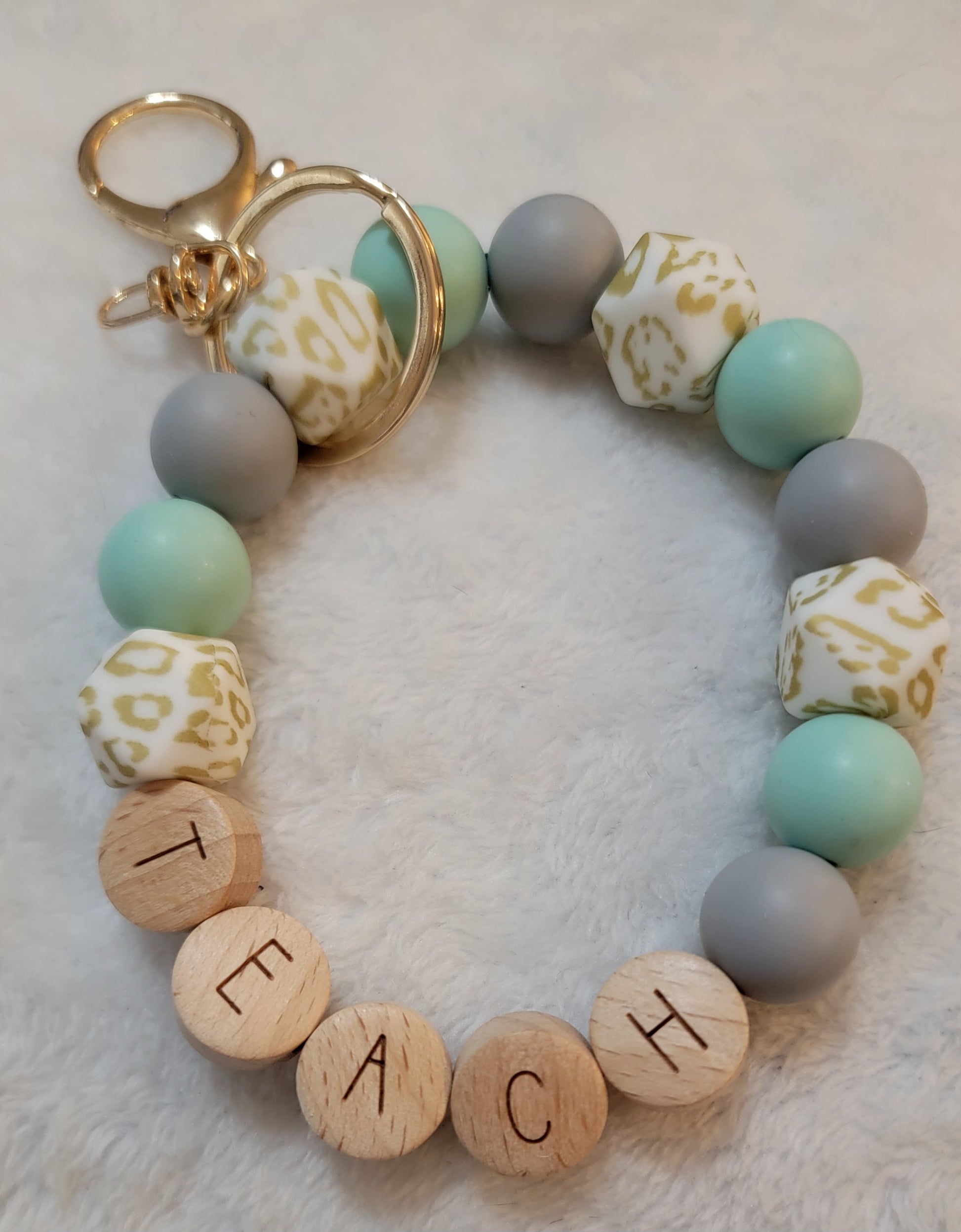 This wristlet features a combination of durable silicone beads and wooden beads that spell out "Teach". With its stylish design and available in various styles, this wristlet is the perfect accessory for educators on the go. Made with high-quality materials, it offers both functionality and style. A must-have for any teacher or educational professional.